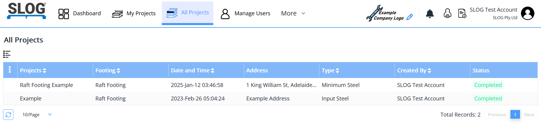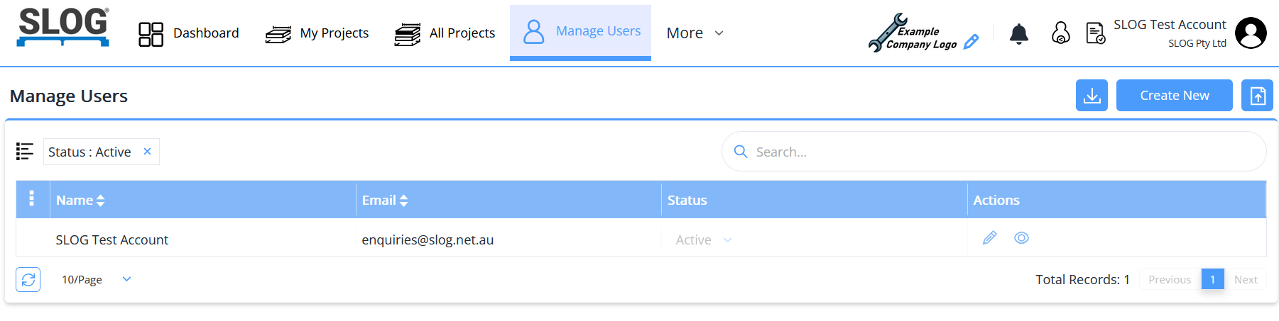 The My Projects tab contains all projects made by the current user, the All Projects tab contains all projects made by any employees that are users within this company's account. The Manage Users tab lists all employees within this company's account.