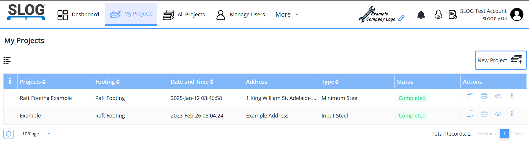 On logging into your account, the following screen is presented, which gives an overview of the features of SLOG and lists your created projects: