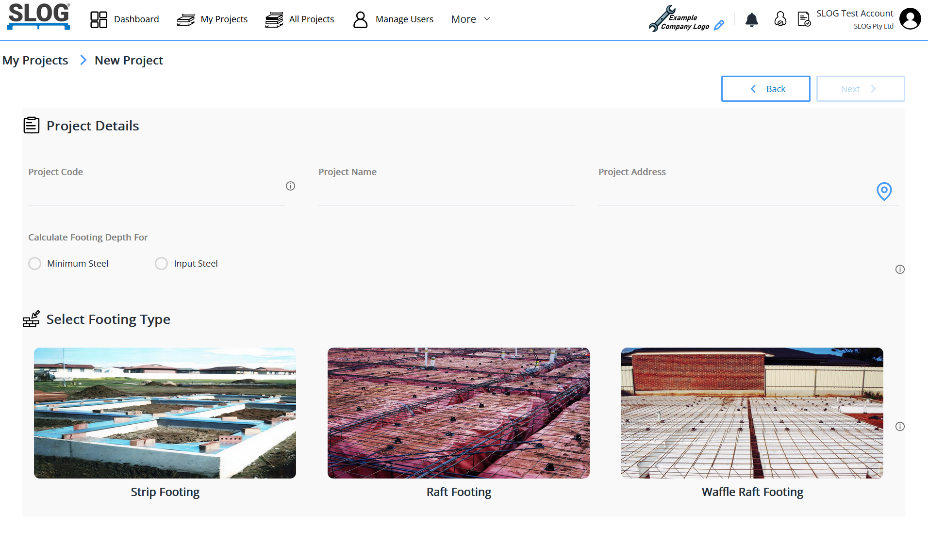 The option after inputting the project code, project name and address, is whether to choose a design for minimum steel or input steel. For the Minimum Steel option, the design can be carried out to determine the footing depth with the minimum amount of reinforcing steel to meet the stiffness requirement of AS 2870 – 2011 clause 4.4 (e), the strength requirement of clause 4.4 (d) and the ductility requirement of clause 4.4 (f).