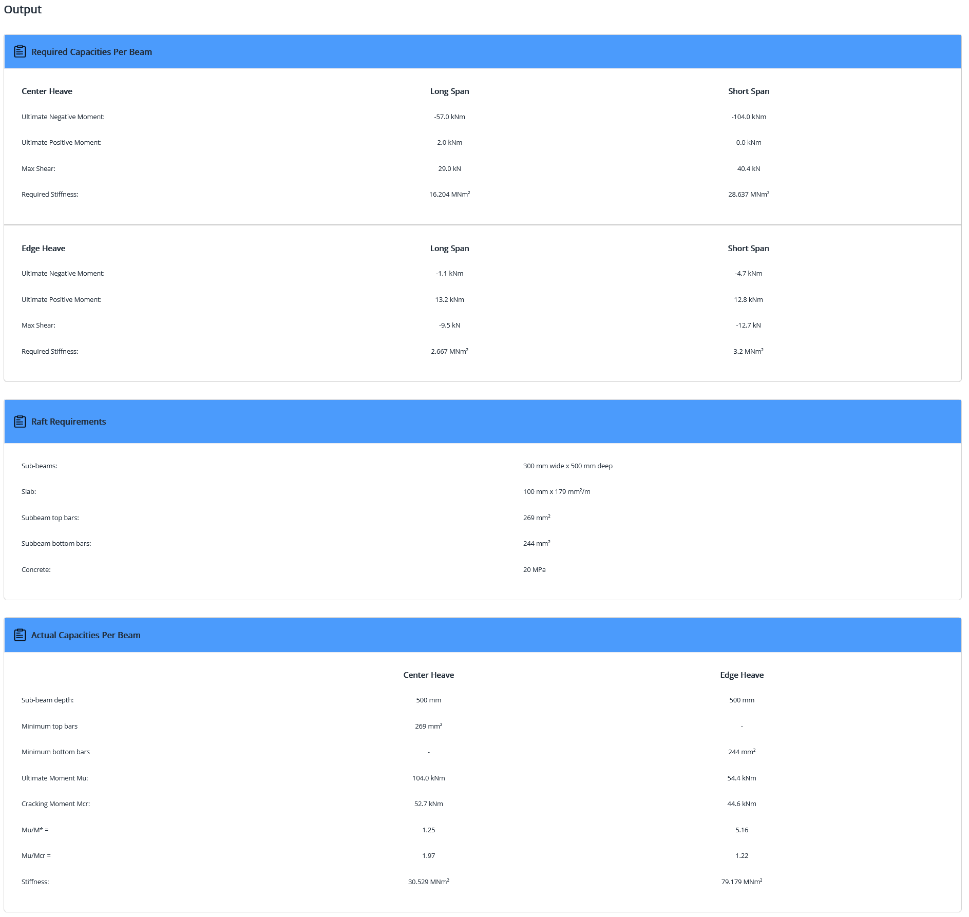 It can be seen from the “Output – Raft Footing” summary, that the required sub-beam depth for the lower grade but higher quantity steel is still 500 mm. However note that SLOG® warns the user that the Mu/M* ratio in centre heave is less than the minimum of 1.25 required by AS 2870-2011 clause 4.4(d) so that the designer should increase the amount of the top sub-beam steel, or use a heavier slab mesh.