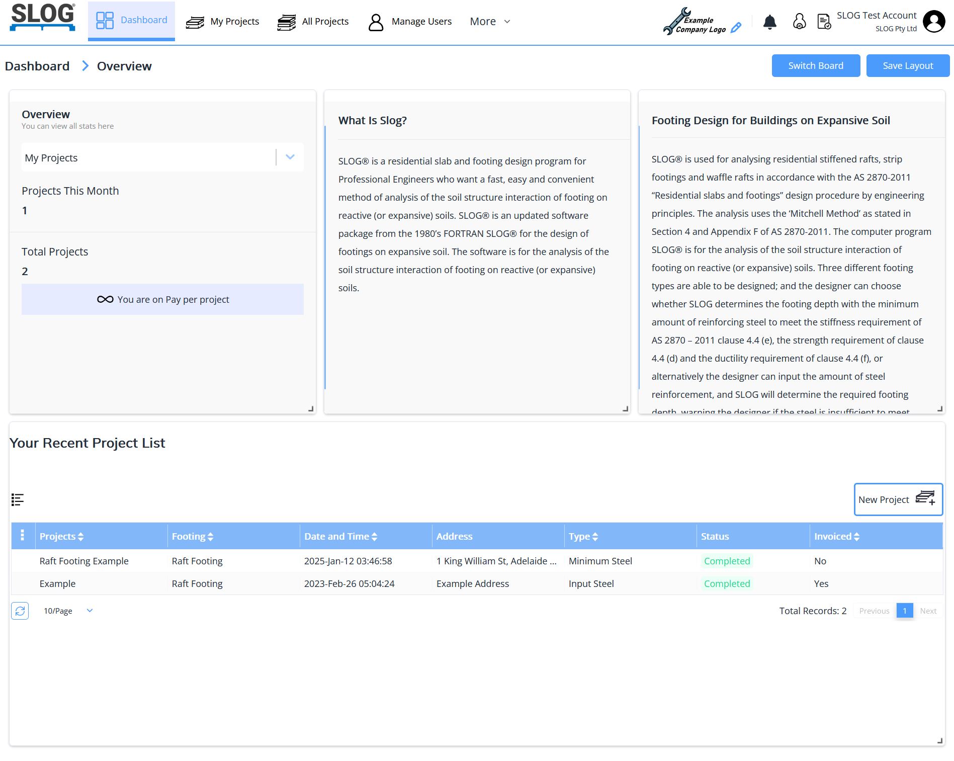 On logging into your account, the following screen is presented, which gives an overview of the features of SLOG and lists your created projects: