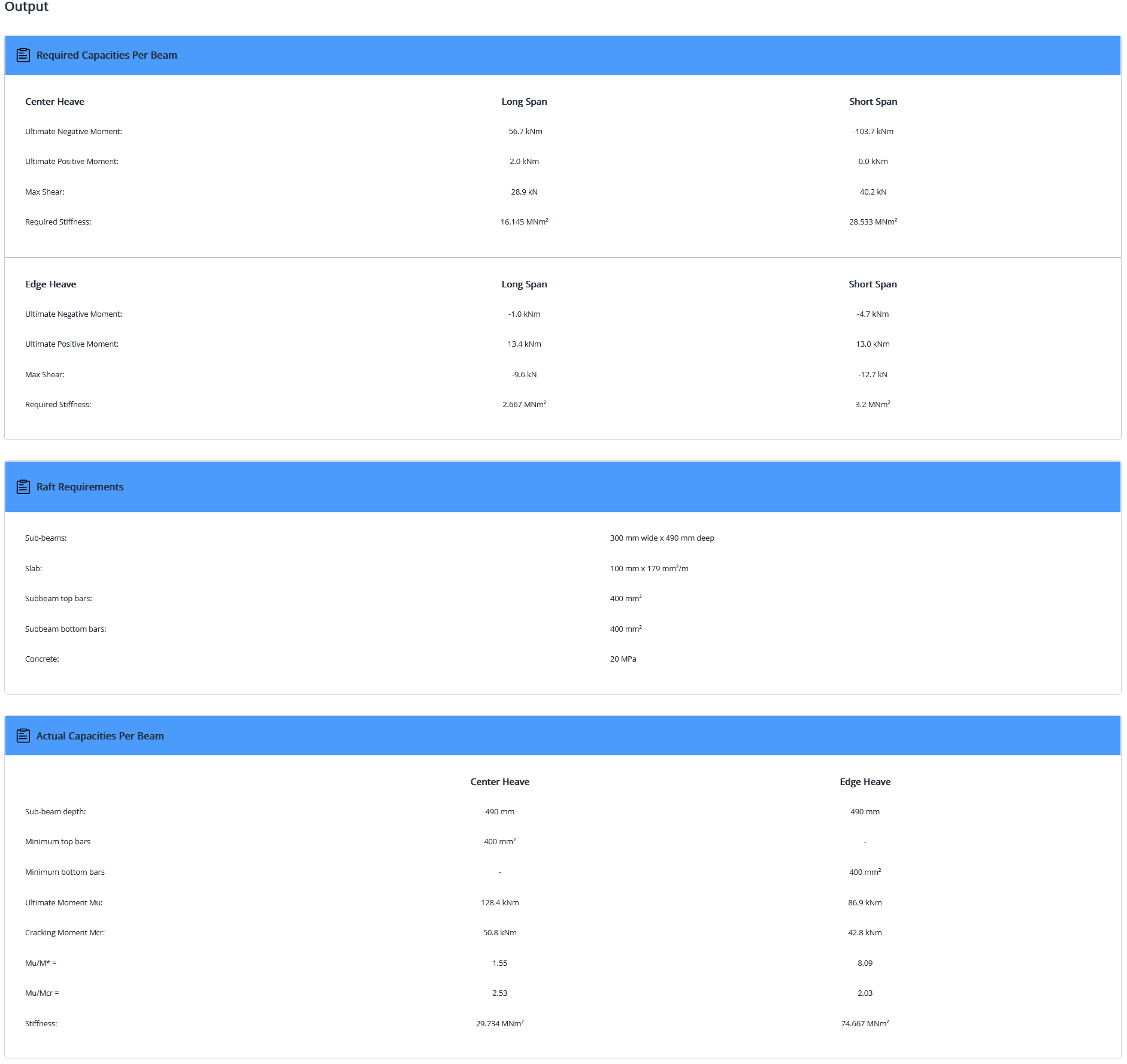 It can be seen from the “Output – Raft Footing” summary, that the required sub-beam depth for the lower grade but higher quantity steel is still 500 mm. However note that SLOG® warns the user that the Mu/M* ratio in centre heave is less than the minimum of 1.25 required by AS 2870-2011 clause 4.4(d) so that the designer should increase the amount of the top sub-beam steel, or use a heavier slab mesh.