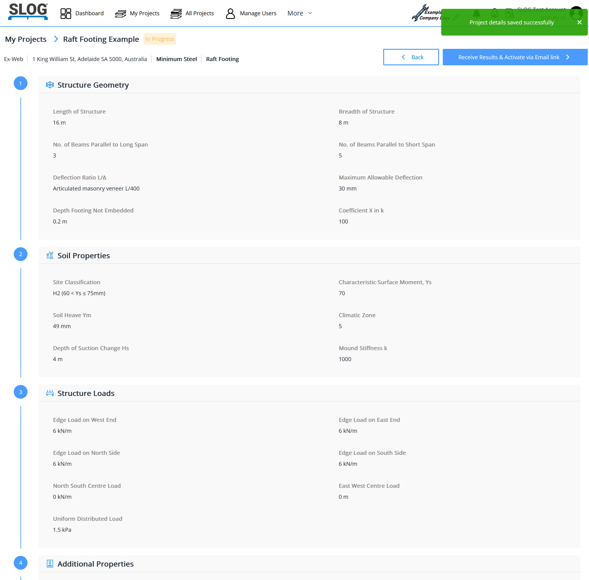 The option after inputting the project code, project name and address, is whether to choose a design for minimum steel or input steel. For the Minimum Steel option, the design can be carried out to determine the footing depth with the minimum amount of reinforcing steel to meet the stiffness requirement of AS 2870 – 2011 clause 4.4 (e), the strength requirement of clause 4.4 (d) and the ductility requirement of clause 4.4 (f).